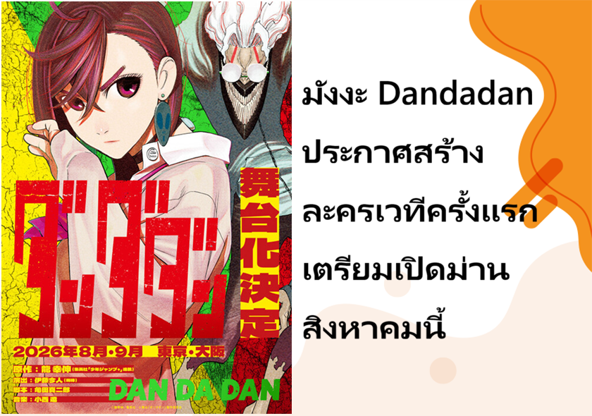 Dandadan มังงะสุดฮิตผลงานของอาจารย์ทัตสึ ยูกิโนบุ (Tatsu Yukinobu) ที่กำลังตีพิมพ์อย่างต่อเนื่องใน Shonen Jump+ เตรียมถูกนำมาดัดแปลงเป็นละครเวทีเป็นครั้งแรก โดยมีกำหนดจัดการแสดงขึ้นในช่วงเดือนสิงหาคมและกันยายน ปี 2026 นี้ ที่กรุงโตเกียวและนครโอซาก้า