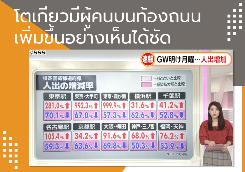ทางสำนักข่าว NTT Docomo ได้รายงานข้อมูลจำนวนผู้คนบนท้องถนนในวันวันทร์ที่ 11 พฤษภาคมที่ผ่านมา โดยเทียบกับจำนวนผู้คนบนท้องถนนในวันก่อนหน้าคือวันที่ 10 พฤษภาคมและจำนวนผู้คนบนท้องถนนในช่วงก่อนเกิดการระบาดของโควิด-19 พบว่าในหลายๆ พื้นที่เริ่มมีภาพผู้คนบนท้องถนนออกมาทำงานมากขึ้น แต่เพิ่มขึ้นอย่างเห็นได้ชัดที่สุดก็คือโตเกียว
