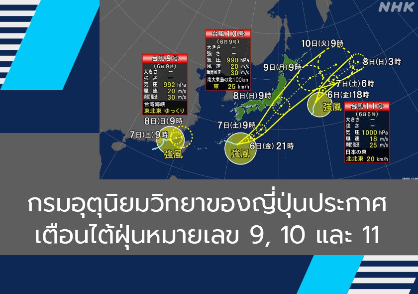 กรมอุตุนิยมวิทยาของญี่ปุ่นได้ประกาศเตือนไต้ฝุ่นหมายเลข 9, 10 และ 11 ที่ก่อตัวขึ้นใกล้กับประเทศญี่ปุ่น โดยอาจส่งผลกระทบดังนี้