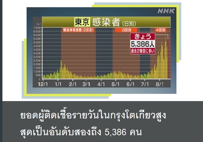 ทางการกรุงโตเกียวรายงานว่ายอดผู้ติดเชื้อโควิด-19 ในกรุงโตเกียว ณ วันพุธที่ 18 สิงหาคมอยู่ที่ 5,386 คน และมีผู้เสียชีวิตเพิ่มอีก 6 คน