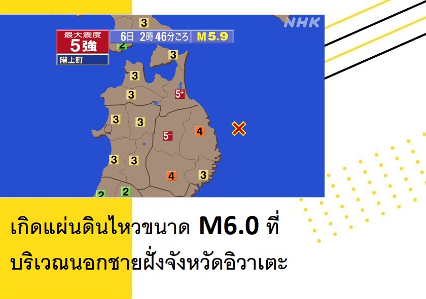 เกิดแผ่นดินไหวขนาด M6.0 ที่บริเวณนอกชายฝั่งจังหวัดอิวาเตะ