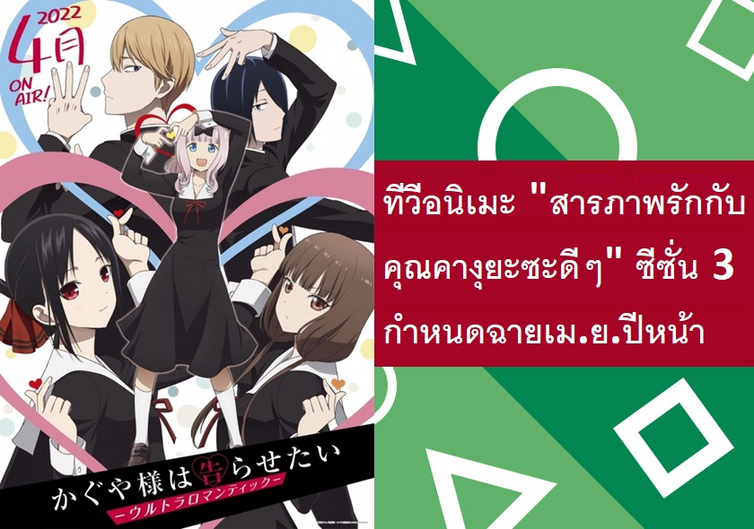 ทีวีอนิเมะ "สารภาพรักกับคุณคางุยะซะดีๆ สงครามประสาทความรักของเหล่าอัจฉริยะ" ซีซั่น 3 หรือในชื่อ "Kaguya-sama wa Kokurasetai: Ultra Romantic" มีกำหนดออกอากาศในญี่ปุ่นเดือนเมษายนปี 2022 โดยยังคงได้สตูดิโอ A-1 Pictures รับหน้าที่ผลิตงานอนิเมชั่นเช่นเดียวกับ 2 ซีซั่นที่ผ่านมา
