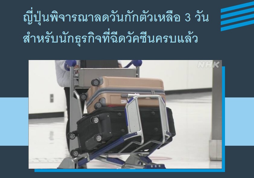 รัฐบาลญี่ปุ่นเตรียมพิจารณาลดระยะเวลากักตัวจาก 10 วันเหลือ 3 วัน สำหรับนักธุรกิจที่ฉีดป้องกันโควิด-19 ครบแล้ว โดยคาดว่าจะมีผลบังคับใช้อย่างเร็วที่สุดในวันที่ 8 พฤศจิกายน