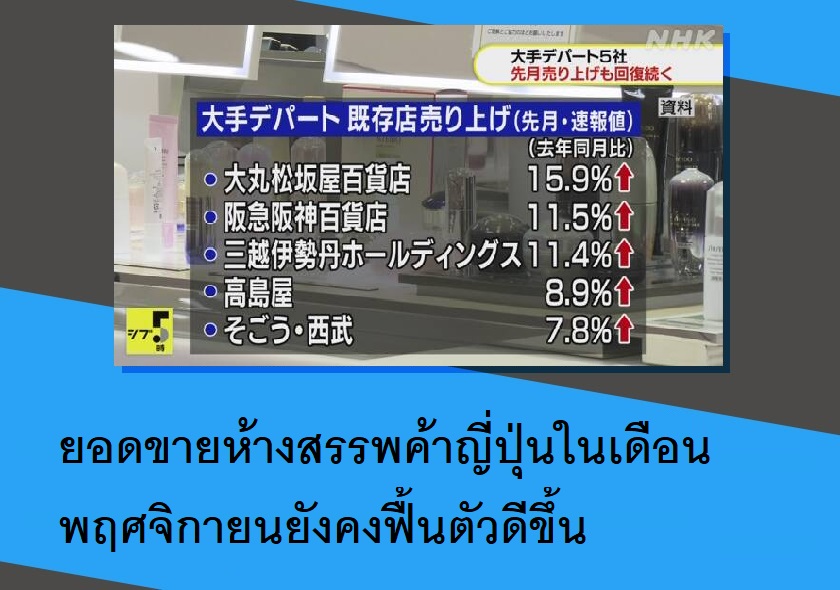 ห้างสรรพสินค้ารายใหญ่ 5 แห่งของญี่ปุ่น ได้แถลงการณ์เกี่ยวกับยอดขายของห้างสรรพสินค้าในเครือของตนประจำเดือนพฤศจิกายนที่ผ่านมา โดยเทียบกับเดือนพฤศจิกายนปีที่แล้ว ดังนี้