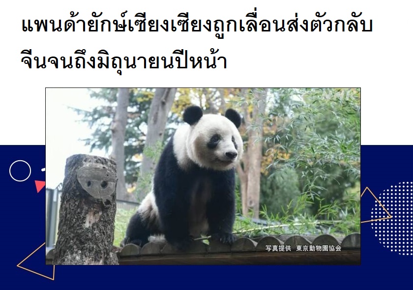 ทางการกรุงโตเกียวประกาศเมื่อวันที่ 7 ธันวาคมว่า แพนด้านยักษ์ "เซียงเซียง" ได้ถูกเลื่อนกำหนดส่งตัวกลับจีนไปจนถึงสิ้นเดือนมิถุนายนปีหน้า จากเดิมที่มีกำหนดส่งตัวกลับในสิ้นเดือนนี้