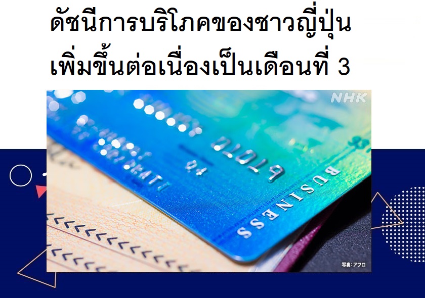 บริษัทวิเคราะห์ข้อมูล Nowcast และ JCB ผู้ให้บริการบัตรเครดิตรายใหญ่ของญี่ปุ่นเผยว่า ดัชนีการบริโภคผ่านบัตรเครดิตของชาวญี่ปุ่นได้เพิ่มขึ้นอย่างต่อเนื่องเป็นเดือนที่ 3 แล้ว นับตั้งแต่เดือนตุลาคมที่ผ่านมา