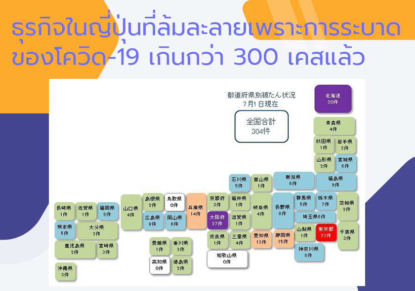 ธุรกิจต่างๆ ทั่วประเทศญี่ปุ่นที่ล้มละลายจากการแบกรับหนี้สินเกินกว่า 10 ล้านเยน เนื่องจากการระบาดของโควิด-19 มีจำนวนกว่า 304 เคส ซึ่งในบรรดาทั้ง 304 เคสนั้น ธุรกิจที่ปิดกิจการลงแล้วมีจำนวน 229 เคส และกำลังเตรียมปิดกิจการลงอีกจำนวน 75 เคส