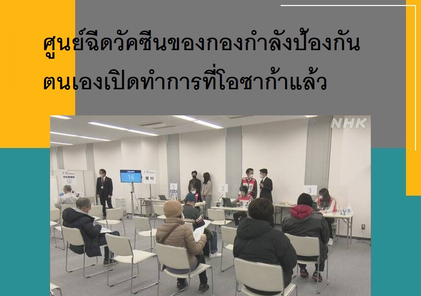 ศูนย์ฉีดวัคซีนขนาดใหญ่ที่ดำเนินการโดยกองกำลังป้องกันตนเองของญี่ปุ่นได้เริ่มทำการแล้วที่อาคาร Yagi Building เขตจูโอ จังหวัดโอซาก้า เพื่อดำเนินการฉีดวัคซีนเข็มที่ 3 ให้กับประชาชนทั่วไปตั้งแต่วันที่ 7 กุมภาพันธ์