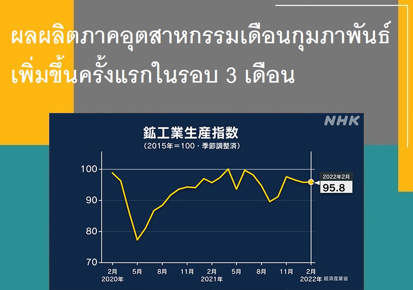 กระทรวงเศรษฐกิจ การค้า และอุตสาหกรรมของญี่ปุ่น (METI) เผยว่า ผลผลิตทางอุตสาหกรรมของญี่ปุ่นในเดือนกุมภาพันธ์อยู่ที่ 95.8% เพิ่มขึ้น 0.1% จากเดือนมกราคม และยังเพิ่มขึ้นเป็นครั้งแรกในรอบ 3 เดือน