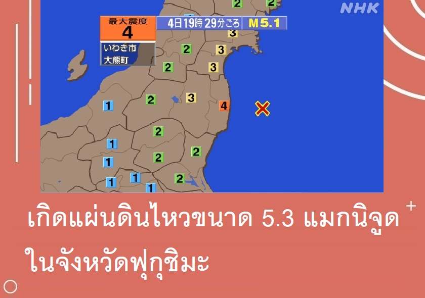 กรมอุตุนิยมวิทยาของญี่ปุ่นระบุว่า เมื่อวันที่ 4 เมายน เวลาประมาณ 19.29 น. ตามเวลาประเทศญี่ปุ่นได้เกิดแผ่นดินไหวขนาด 5.3 แมกนิจูดในจังหวัดฟุกุชิมะ และวัดแรงสั่นสะเทือนได้สูงสุดที่ระดับ 4 ตามมาตรวัดแผ่นดินไหวของญี่ปุ่นที่มีตั้งแต่ระดับ 0-7