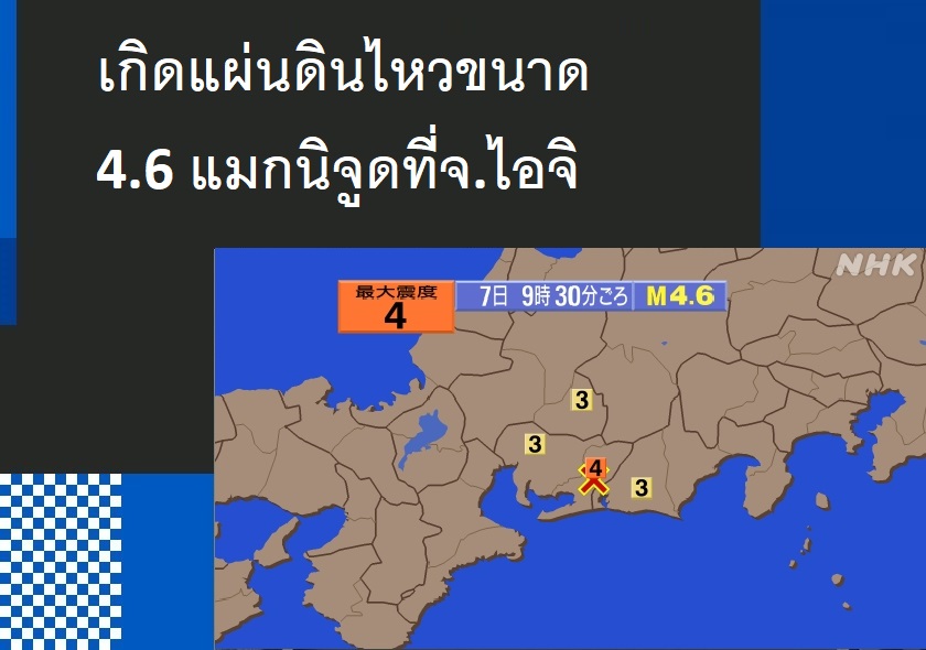 กรมอุตุนิยมวิทยาของญี่ปุ่นรายงานว่า เมื่อวันที่ 7 เมายน เวลาประมาณ 9.30 น. ตามเวลาประเทศญี่ปุ่น ได้เกิดแผ่นดินไหวขนาด 4.6 แมกนิจูดที่เมืองชินชิโระ จังหวัดไอจิ