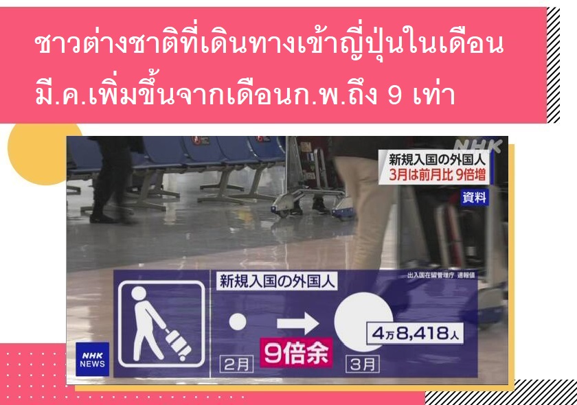 ชาวต่างชาติที่เดินทางเข้าญี่ปุ่นในเดือนมี.ค.เพิ่มขึ้นจากเดือนก.พ.ถึง 9 เท่า