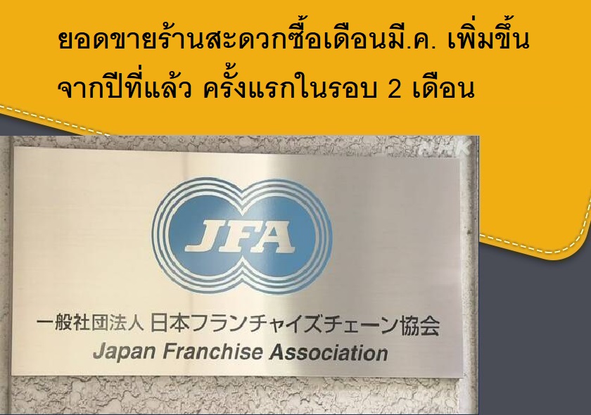 สมาคมผู้ประกอบการแฟรนไชส์ของญี่ปุ่นเผยว่า ยอดขายร้านสะดวกซื้อรายใหญ่ของญี่ปุ่นในเดือนมีนาคมอยู่ที่ 8.75 แสนล้านเยน เพิ่มขึ้น 1.2% จากเดือนมีนาคมปีที่แล้ว และยังนับเป็นครั้งแรกในรอบ 2 เดือนที่ยอดขายเพิ่มขึ้นจากปีที่แล้ว