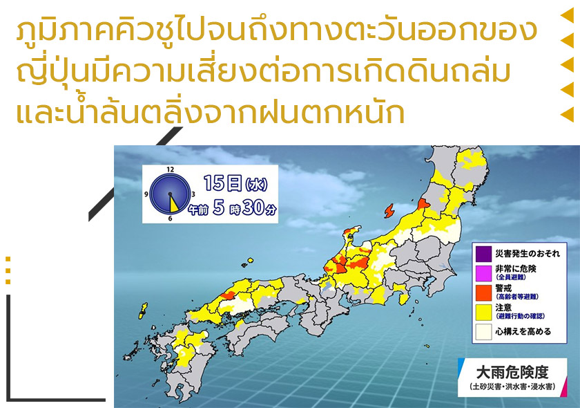 ภูมิภาคคิวชูไปจนถึงทางตะวันออกของญี่ปุ่นมีความเสี่ยงต่อการเกิดดินถล่มและน้ำล้นตลิ่งจากฝนตกหนัก