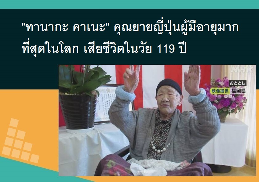 "ทานากะ คาเนะ" คุณยายญี่ปุ่นชาวญี่ปุ่นจากเมืองฟุกุโอกะ ผู้ได้รับการบันทึกลงในสถิติของกินเนสส์บุ๊คว่าเป็นผู้ที่มีอายุมากที่สุดในโลก ได้เสียชีวิตลงที่โรงพยาบาลแห่งหนึ่งในเมืองฟุกุโอกะเมื่อวันที่ 19 เมษายน ด้วยอายุ 119 ปี