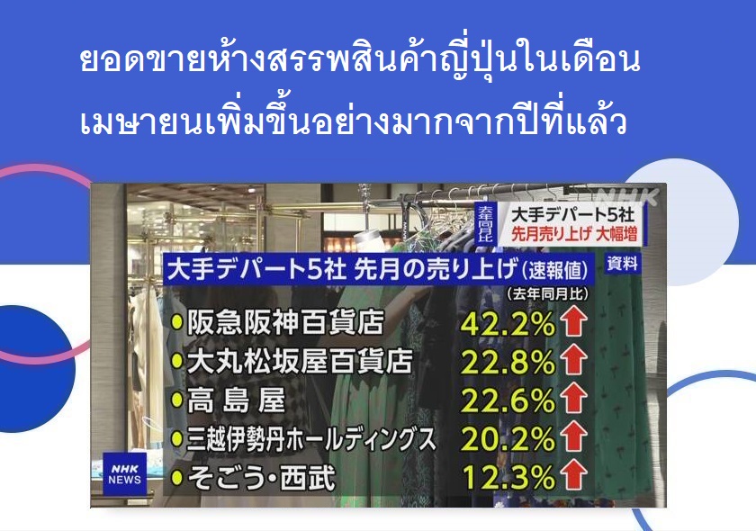 วันที่ 2 พฤษภาคม ห้างสรรพสินค้ารายใหญ่ของญี่ปุ่น 5 แห่งได้ประกาศยอดขายเมื่อเดือนเมษายนที่ผ่านมาโดยเทียบกับเดือนเมษายนปีที่แล้วดังนี้