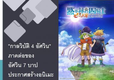 มังงะเรื่อง "กาลวิบัติ 4 อัศวิน" (黙示録の四騎士) ภาคต่ออย่างเป็นทางการของ "ศึกตำนาน 7 อัศวิน" (七つの大罪) ของอาจารย์ซุซุกิ นาคาบะ ได้ประกาศสร้างเป็นทีวีอนิเมะแล้ว แต่ยังไม่ได้ประกาศรายละเอียดเพิ่มเติมในส่วนของสตูดิโอที่สร้าง ทีมงาน และกำหนดการออกอากาศ