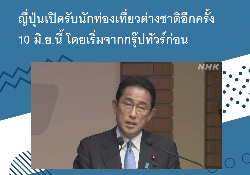 วันที่ 26 พฤษภาคม นายคิชิดะ ฟูมิโอะ นายกรัฐมนตรีของญี่ปุ่น ประกาศเปิดรับนักท่องเที่ยวต่างชาติอีกครั้งอีกครั้งตั้งแต่วันที่ 10 มิถุนายนนี้ โดยเริ่มจากกรุ๊ปทัวร์ก่อน และตั้งแต่วันที่ 1 มิถุนายนนี้เป็นต้นไปจะปรับเพิ่มเพดานจำนวนผู้เดินทางเข้าประเทศสูงสุดจากเดิม 10,000 คนต่อวันเป็น 20,000 คนต่อวัน