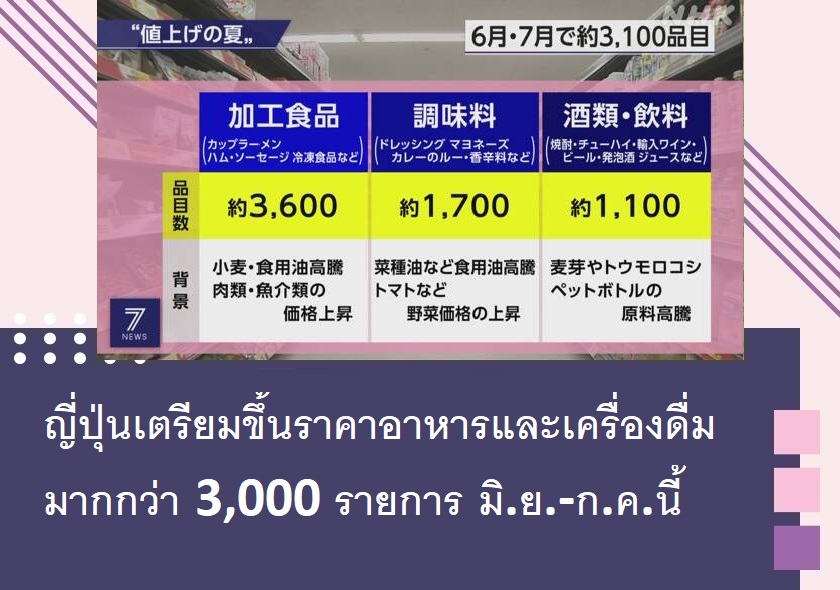 โดยสรุปแล้วสินค้าประเภทผลิตภัณฑ์อาหารและเครื่องดื่มจำนวนมากกว่า 3,100 รายการ เตรียมปรับขึ้นราคาระหว่างเดือนมิถุนายนถึงกรกฎาคมนี้มี และบริษัท Teikoku Databank กล่าวว่า "ในช่วงฤดูร้อนนี้ราคาสินค้าต่างๆ มีแนวโน้มเพิ่มขึ้นจากต้นทุนที่เพิ่มขึ้นสูงขึ้นอย่างรวดเร็วในช่วงที่ผ่านมา"