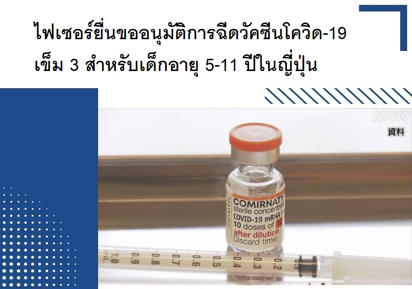 วันที่ 22 มิถุนายน ไฟเซอร์ บริษัทเวชภัณฑ์รายใหญ่ของสหรัฐ ได้ยื่นคำร้องต่อกระทรวงสาธารณสุข แรงงาน และสวัสดิการของญี่ปุ่น เพื่อขออนุมัติการฉีดวัคซีนป้องโควิด-19 เข็มที่ 3 สำหรับเด็กอายุ 5-11 ปี