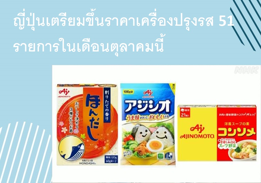 อายิโนะโมโต๊ะ บริษัทผู้ผลิตอาหารรายใหญ่ของญี่ปุ่น ประกาศขึ้นราคาเครื่องปรุงรสสำหรับใช้ในครัวเรือน 51 รายการ เช่น เกลือ, ดาชิ (ซุปญี่ปุ่น), คอนโซเมะ (ซุปก้อนกึ่งสำเร็จรูป) ตั้งแต่วันที่ 1 ตุลาคมนี้ เนื่องจากราคาวัตถุดิบที่พุ่งสูงขึ้น