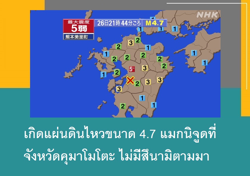 กรมอุตุนิยมวิทยาของญี่ปุ่นรายงานว่า เมื่อวันที่ 26 มิถุนายน เวลาประมาณ 21.44 น. ตามเวลาประเทศญี่ปุ่นได้เกิดแผ่นดินไหวขนาด 4.7 แมกนิจูดที่จังหวัดคุมาโมโตะ