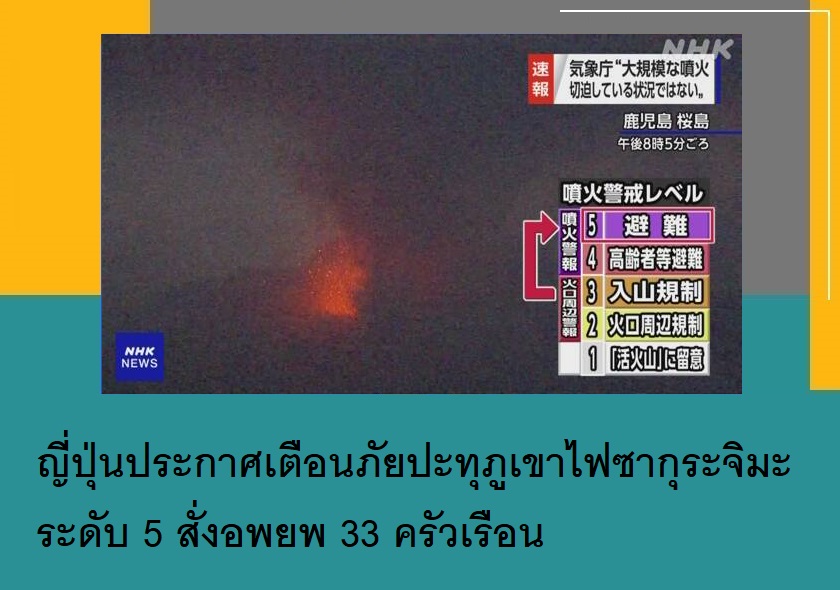 ญี่ปุ่นประกาศเตือนภัยปะทุภูเขาไฟซากุระจิมะระดับ 5 สั่งอพยพ 33 ครัวเรือน