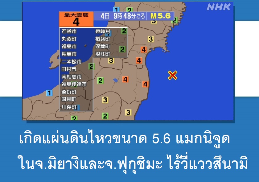 เกิดแผ่นดินไหวขนาด 5.6 แมกนิจูดในจ.มิยางิและจ.ฟุกุชิมะ ไร้วี่แววสึนามิ