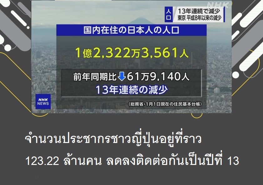 จำนวนประชากรชาวญี่ปุ่นอยู่ที่ราว 123.22 ล้านคน ลดลงติดต่อกันเป็นปีที่ 13