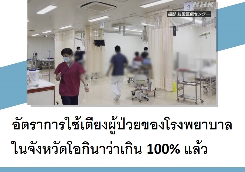 ทางการจังหวัดโอกินาว่ารายงานว่า อัตราการใช้เตียงผู้ป่วยโควิด-19 ของโรงพยาบาลในพื้นที่เกาะหลักของจังหวัดโอกินาว่าพุ่งสูงเกิน 100% แล้ว นอกจากนี้อัตราการใช้เตียงของผู้ป่วยโรคอื่นๆ ที่ไม่ใช่โควิด-19 ก็สูงไม่แพ้กัน ทำให้ทางโรงพยาบาลกำลังเผชิญกับสถานการณ์สิ้นหวังถึงขั้นที่ไม่สามารถรับผู้ป่วยเพิ่มได้แล้ว