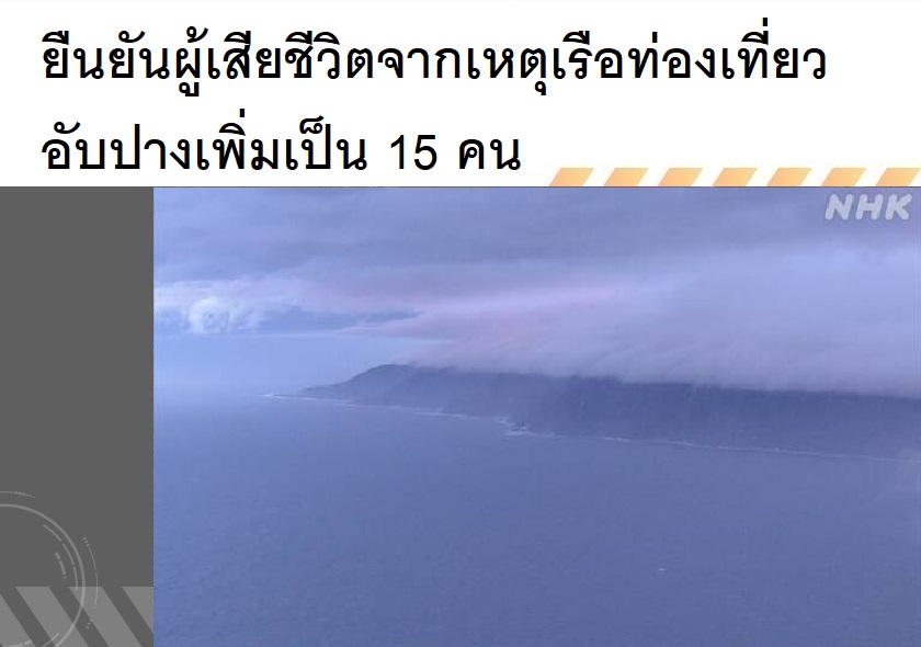 ในเดือนเมษายนที่ผ่านมา ได้เกิดอุบัติเหตุเรือท่องเที่ยวของจังหวัดฮอกไกโดที่มีผู้โดยสารและลูกเรือทั้งหมด 32 คนอับปางลงกลางทะเลนอกชายฝั่งของคาบสมุทรชิเรโตโกะ จนถึงตอนนี้พบศพผู้เสียชีวิตแล้ว 14 คน ขณะที่เหลืออีก 12 คนยังคงไม่ทราบชะตากรรม