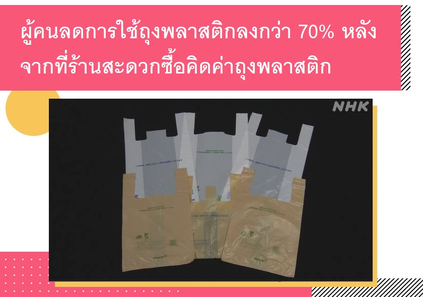 เมื่อวันที่ 1 กรกฎาคมที่ผ่านมา หลังจากที่ทางร้านสะดวกซื้อรายใหญ่ 3 เจ้าในญี่ปุ่น ได้แก่ 7-Eleven, Family Mart และ Lawson ได้เริ่มใช้นโยบายเก็บค่าถุงพลาสติกใบละ 3 เยนเพื่อกระตุ้นให้ประชาชนลดการใช้ถุงพลาสติก โดยมีจุดประสงค์เพื่อลดปริมาณ ขยะพลาสติกและลดปัญหาสิ่งแวดล้อมในประเทศ พบว่าลูกค้าที่มาใช้บริการที่ร้านสะดวกซื้อแต่ละเจ้าทั่วประเทศเกินกว่า 70% เลือกที่จะไม่รับถุงพลาสติก โดย 7-Eleven อยู่ที่ 75%, Family Mart อยู่ที่ 77% และ Lawson อยู่ที่ 76% จากที่ก่อนหน้าที่จะมีการ คิดค่าถุงพลาสติก มีลูกค้าที่เลือกไม่รับถุงพลาสติกอยู่เพียง 25% เท่านั้น โดยลูกค้าที่มาซื้อสินค้าแล้วเลือกที่จะไม่รับถุงพลาสติกนั้น บางคนก็นำถุงผ้าส่วนตัวมาเองไม่ก็ถือสินค้ากลับ อีกทั้ง Family Mart ยังได้ระบุว่า หากอัตราการใช้ถุงพลาสติกลดลงต่อไปได้เช่นนี้ ใน 1 ปี ประเทศญี่ปุ่นอาจลดปริมาณขยะพลาสติกลงได้ถึง 9,000 ตันเลยทีเดียว