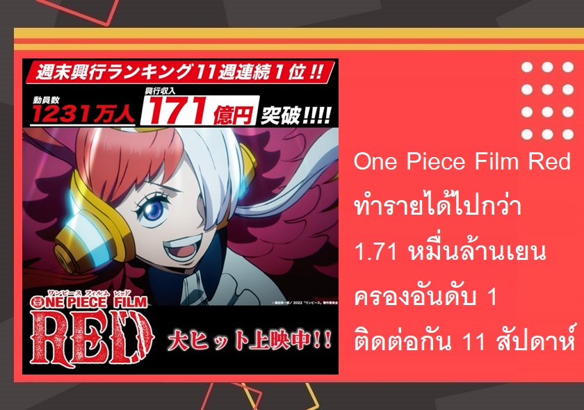 One Piece Film Red ทำรายได้ไปกว่า 1.71 หมื่นล้านเยน ครองอันดับ 1 ติดต่อกัน 11 สัปดาห์
