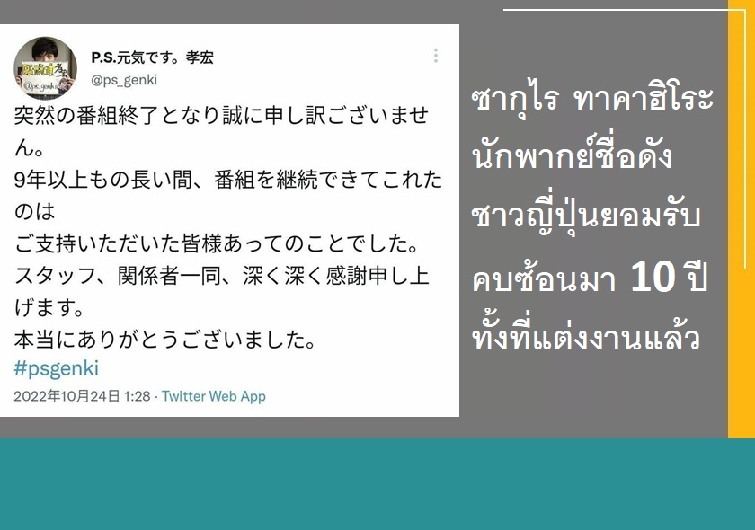 วันที่ 26 ตุลาคม คุณซากุไร ทาคาฮิโระ นักพากย์ชายชื่อดังวัย 48 ปี ได้ออกมายอมรับว่าตนเองแอบคบชู้กับนางสาว A (นามสมมุติ) ซึ่งเป็นทีมงานที่ทำหน้าที่เขียนสคริปต์รายการ PS GenkiDesu ที่คุณซากุไรอากาศมานานเกือบ 10 ปี
