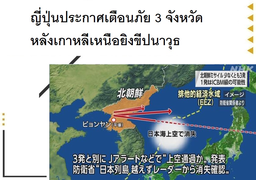 ญี่ปุ่นประกาศเตือนภัย 3 จังหวัด หลังเกาหลีเหนือยิงขีปนาวุธ