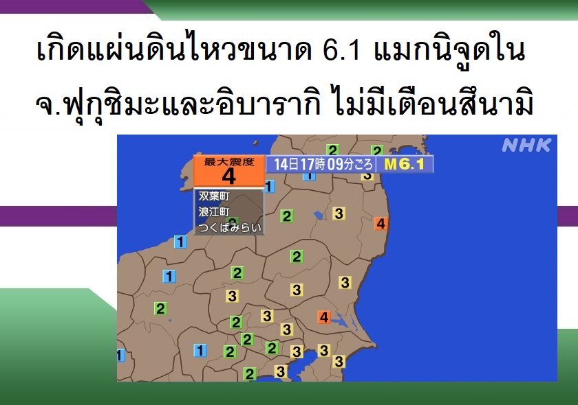 เกิดแผ่นดินไหวขนาด 6.1 แมกนิจูดในจ.ฟุกุชิมะและอิบารากิ ไม่มีเตือนสึนามิ