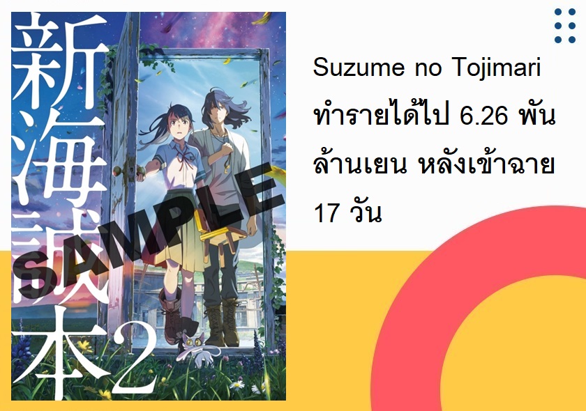 ภาพยนตร์อนิเมะ Suzume no Tojimari ผลงานล่าสุดของผู้กำกับชินไค มาโคโตะ สามารถทำรายได้ในญี่ปุ่นไปกว่า 6.26 พันล้านเยน ด้วยจำนวนผู้ชมกว่า 4.6 ล้านคน หลังจากเข้าฉายไป 17 วัน นับตั้งแต่วันที่ 11 พฤศจิกายน
