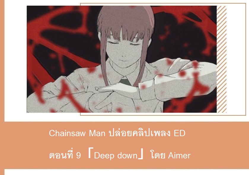 สำหรับเพลง ED จากอนิเมะ Chainsaw Man ตอนที่ 9 มีชื่อเพลงว่า "Deep down" ร้องโดย Aimer (เอเม่) นักร้องและนักแต่งเพลงหญิงชาวญี่ปุ่นที่ร้องเพลงประกอบอนิเมะชื่อดังมากมาย เช่น Kimetsu no Yaiba, Fate/stay night