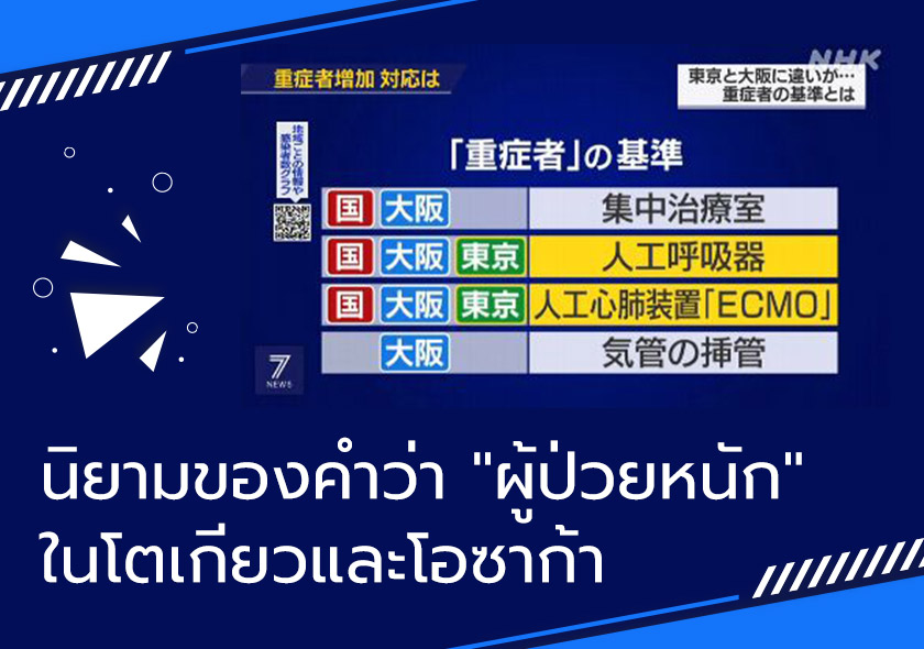 ในสถานการณ์การแพร่ระบาดของโควิด-19 ที่จำนวนผู้ป่วยหนักมีแนวโน้มเพิ่มมากขึ้นในแต่ละพื้นที่โดยเฉพาะที่โตเกียวและโอซาก้า โดยเมื่อพิจารณาตัวเลขผู้ป่วยหนักเมื่อวันที่ 17 สิงหาคมที่ผ่านมา โอซาก้าพบผู้ป่วยหนักอยู่ที่ 70 คน ส่วนทางโตเกียวพบผู้ป่วยหนัก อยู่ที่ 31 คน ซึ่งจะเห็นว่าจำนวนผู้ป่วยหนักที่โอซาก้ามีมากกว่าที่โตเกียวถึง 2 เท่าแต่ภายหลังได้ทราบว่า เกณฑ์ในการติดสินว่าเป็น "ผู้ป่วยหนัก" ของโอซาก้าและโตเกียวนั้นกลับไม่เหมือนกัน แม้ว่าเกณฑ์ดังกล่าวทางกระทรวงสาธารณสุขได้เป็นผู้กำหนดไว้แล้ว