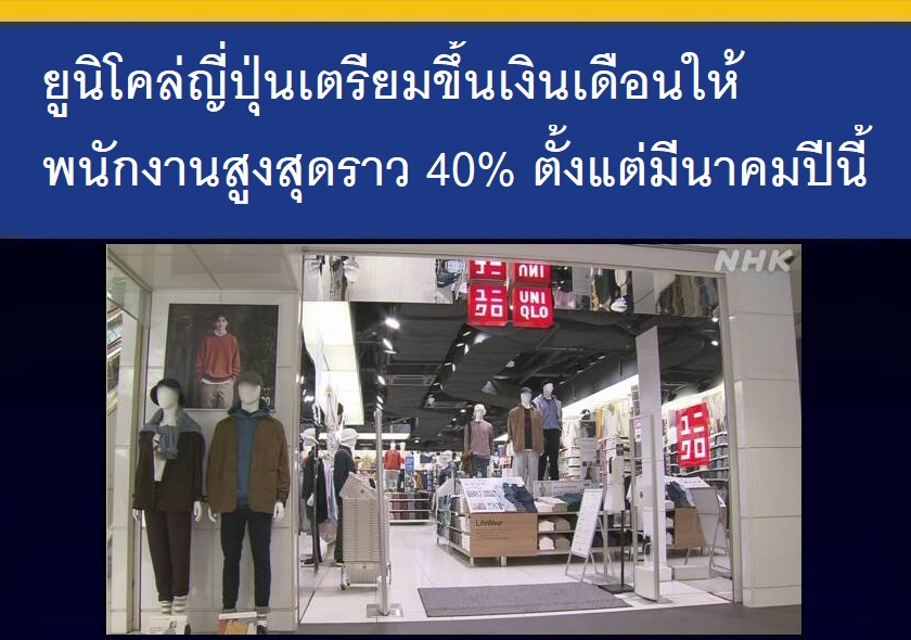 ยูนิโคล่ (Uniqlo) ญี่ปุ่นประกาศขึ้นเงินเดือนให้กับพนักงานประจำซึ่งมีอยู่ทั้งหมดราว 8,400 คนในญี่ปุ่นสูงสุดถึง 40% จากเดิมที่มีการปรับขึ้นเงินเดือนประจำปีไม่กี่เปอร์เซ็นต์ เริ่มตั้งแต่เดือนมีนาคมปีนี้