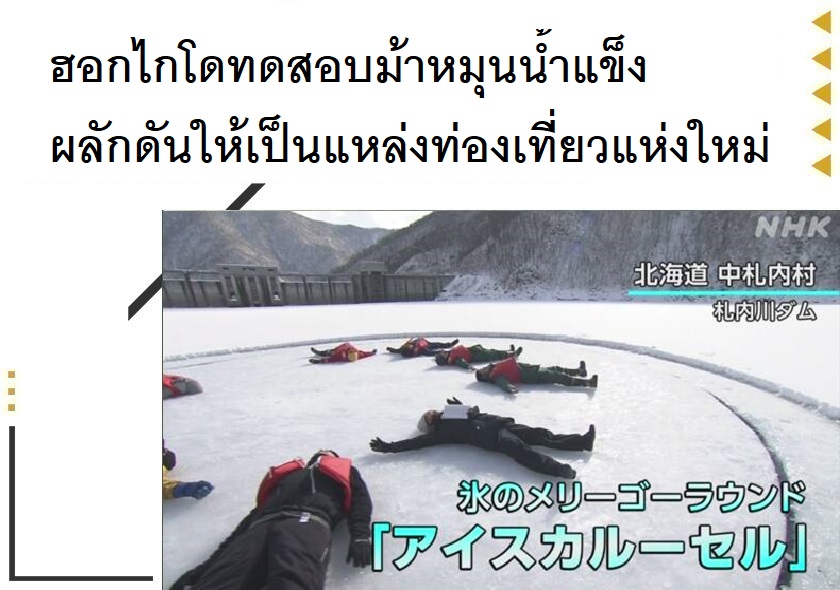 ทางการฮอกไกโดที่หวังอยากนำไอเดีย "ม้าหมุนน้ำแข็ง" มาผลักดันให้เป็นแหล่งท่องเที่ยวแห่งใหม่ ได้มีการทดลองเล่นกันที่เขื่อนแม่น้ำซัตสึไน ในหมู่บ้านนากาซัตสึไน จังหวัดฮอกไกโด