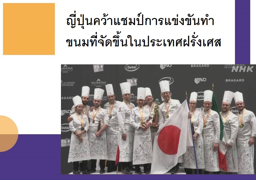 ทีมชาติญี่ปุ่นชนะเจ้าภาพฝรั่งเศสในการแข่ง "Coupe du Monde de la Pâtisserie (Pastry World Cup)" ที่เหล่าปาตีซีเย (pâtissier) จากนานาประเทศต่างมารวมตัวเพื่อประชันฝีมือในการทำขนมหวานสไตล์ตะวันตก