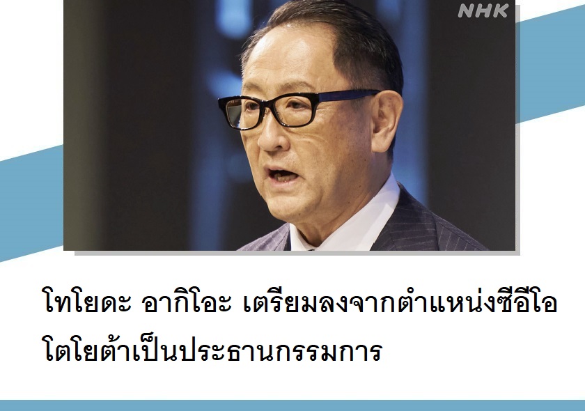 นายโทโยดะ อากิโอะ อายุ 66 ปี ซีอีโอของบริษัทโตโยต้า มอร์เตอร์ (Toyota Motors) ประกาศลงจากตำแหน่งเปลี่ยนไปรับหน้าที่ประธานคณะกรรมการบริหาร (Chairman) แทนตั้งแต่วันที่ 1 เมษายน