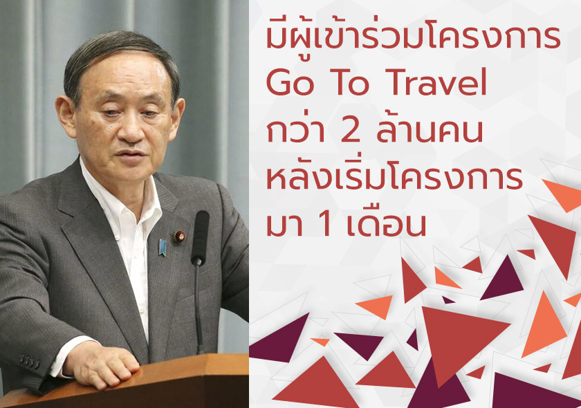 เมื่อวันที่ 24 สิงหาคม นายสึกะ โยชิฮิเดะ หัวหน้าเลขาธิการคณะรัฐมนตรีญี่ปุ่นรายงานว่า มีผู้เข้าร่วมโครงการ Go To Travel เป็นจำนวนกว่า 2 ล้านคนแล้ว หลังจากที่เริ่มโครงการมาเป็นระยะเวลา 1 เดือน ตั้งแต่เมื่อวันที่ 22 กรกฎาคม