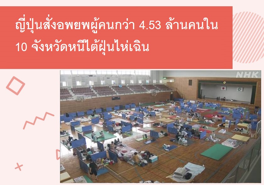 ญี่ปุ่นสั่งอพยพประชาชนกว่า 4.53 ล้านคนใน 10 จังหวัดทางฝั่งตะวันตกเฉียงใต้โดยทันที เนื่องจากไต้ฝุ่นไห่เฉิน หรือไต้ฝุ่นหมายเลข 10 กำลังมุ่งหน้าเข้ามา โดยอิทธิพลของพายุดังกล่าวอาจก่อให้เกิดฝนตกหนัก ลมกระโชกแรง คลื่นทะเลสูง น้ำท่วมฉับพลัน และดินโคลนถล่ม