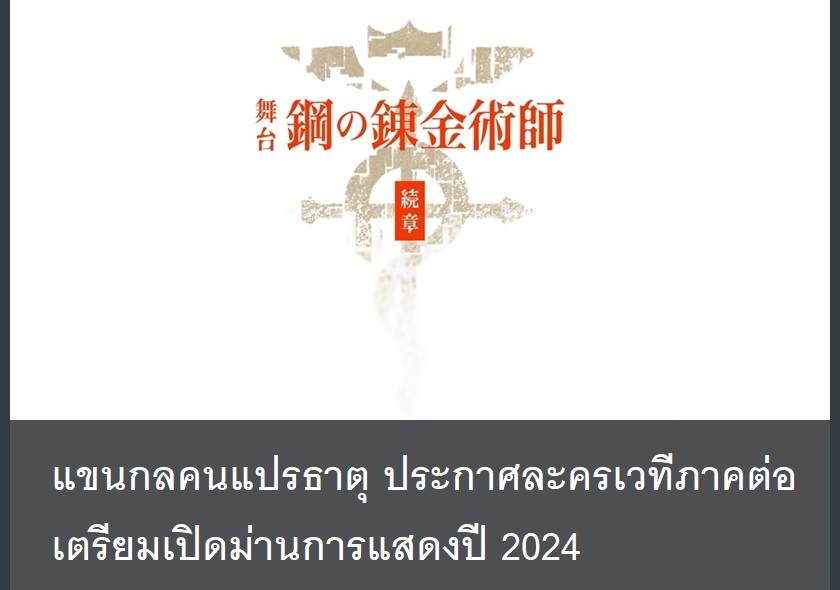 แขนกลคนแปรธาตุ (Fullmetal Alchemist) มังงะชื่อดังของอาจารย์อาราคาวะ ฮิโรมุ (Arakawa Hiromu) ประกาศสร้างละครเวทีภาคต่ออย่างเป็นทางการแล้ว โดยมีกำหนดเปิดม่านการแสดงภายในปี 2024