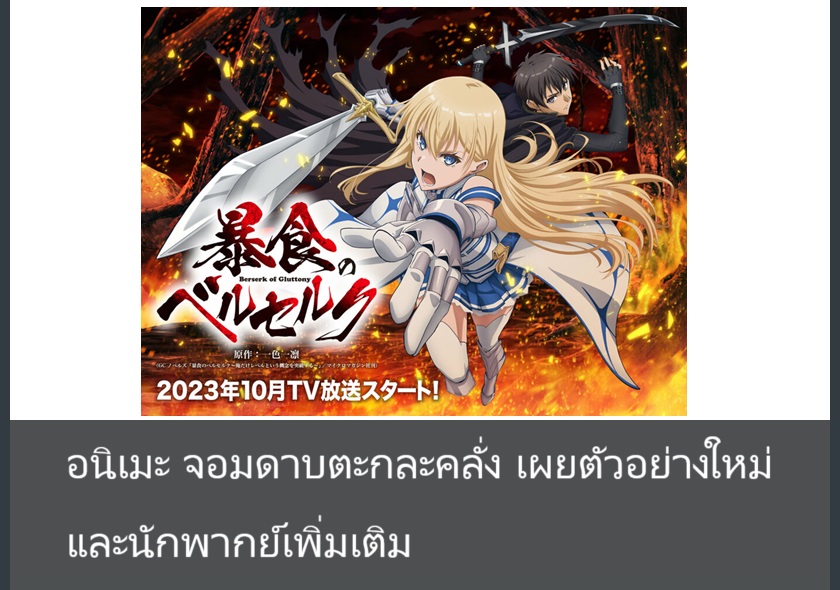 ทวิตเตอร์ทางการของอนิเมะ จอมดาบตะกละคลั่ง (Boshoku no Berserk) ได้เผยตัวอย่างใหม่ และนักพากย์เพิ่มเติมออกมาแล้ว