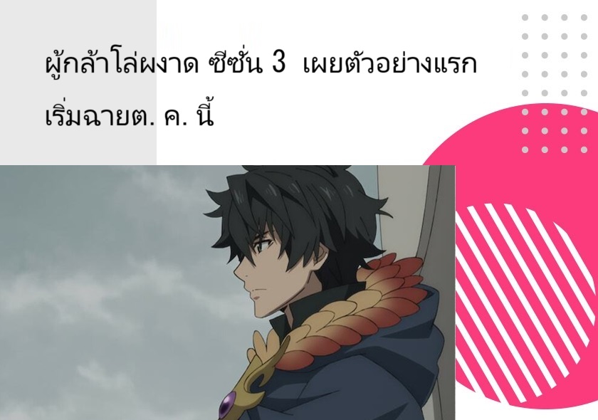 อนิเมะ ผู้กล้าโล่ผงาด ซีซั่น 3 ผลิตโดยสตูดิโอ Kinema Citrus มีกำหนดออกอากาศในเดือนตุลาคมนี้