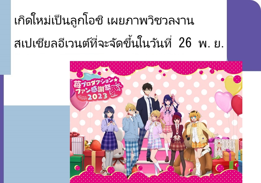 ทวิตเตอร์ทางการของอนิเมะ เกิดใหม่เป็นลูกโอชิ (Oshi no Ko) ได้เผยภาพวิชวลของงานสเปเชียลอีเวนต์ "Ichigo Production ☆ Fan Thanksgiving 2023" ออกมาแล้ว