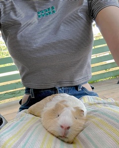นอกจากภาพที่เธอกำลังให้อาหารนกแล้ว คุณเอนาโกะก็ได้โพสต์ภาพที่หนูตะเภากำลังนอนอยู่บนตักเธอด้วย